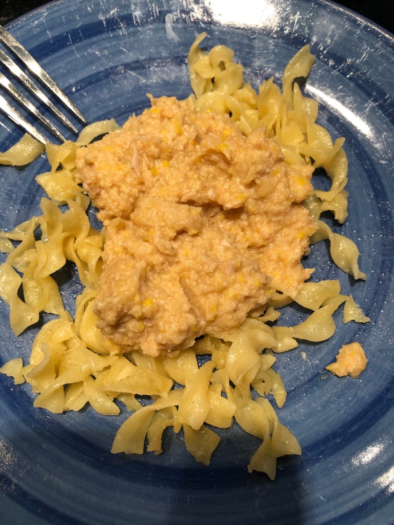 However, with a little cheese on top, Ginger seemed to be pretty into it. I think there is more that I can do to it to make it more palatable, because, honestly that was the pretty awful for me to even taste, but the bigger deal is trying to find something for my girl to set her gums around. She did leave the noodles though, so I’m not sure what we will do about that. Maybe they need to be ground up as well.