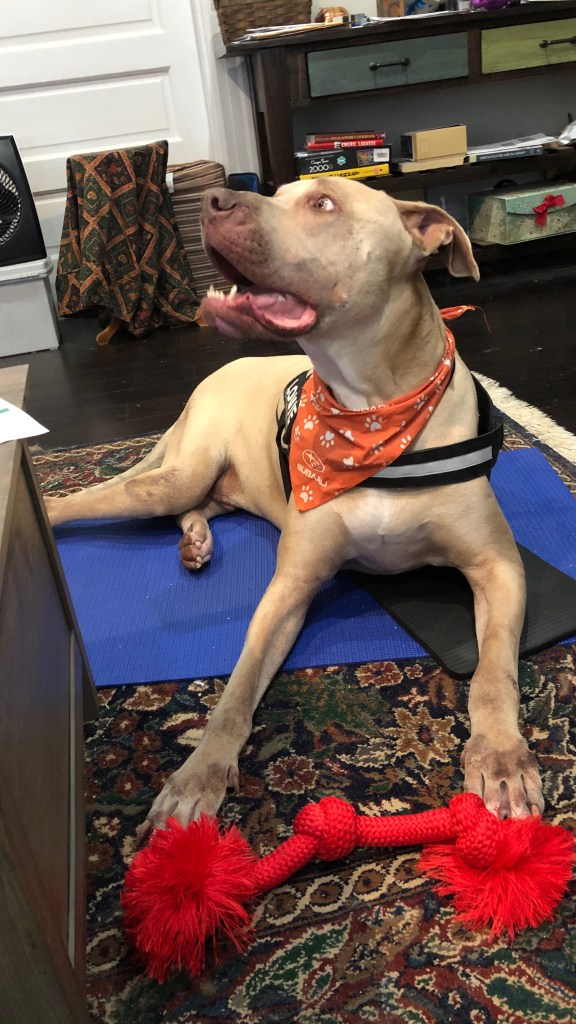 This last week I adopted a dog. I’ve been thinking about getting another companion after my cats died, but I’d had cats for years. I went ahead and started looking for an older dog. This week I settled on Louie. A pit mastiff mix, he is this big ole goofball.